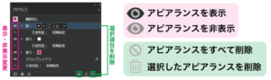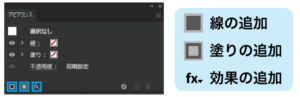 アピアランスの追加はアピアランスパネル左下の3 つのアイコンから行います。