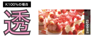 黒色が透けて欲しくない部分には「黒(K)100%に他の色を混ぜる」または「リッチブラック」に設定する事が有効です。